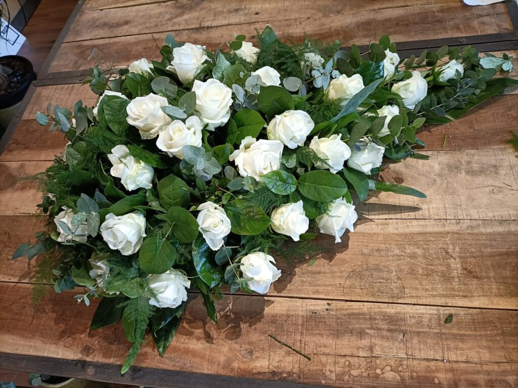 Met de kistbedekking bloemstukken is de kist volledig bedekt onder de bloemen. De kistbedekking kan uit allerlei bloemen bestaan, maar u kunt ook voor één soort bloem kiezen. Personaliseer uw kistbedekking met een persoonlijke boodschap of tekst door een lint erbij te bestellen.